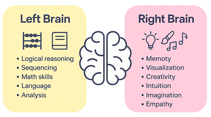 - Right brain development activities like storytelling, puzzles, music, and art encourage memory, concentration, and creativity.